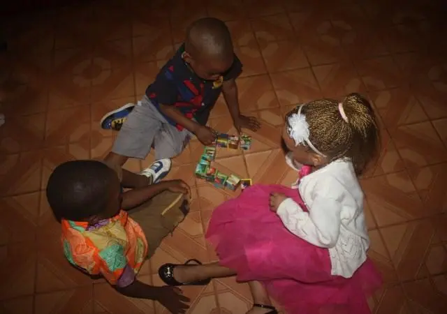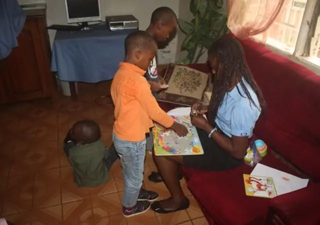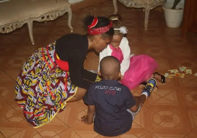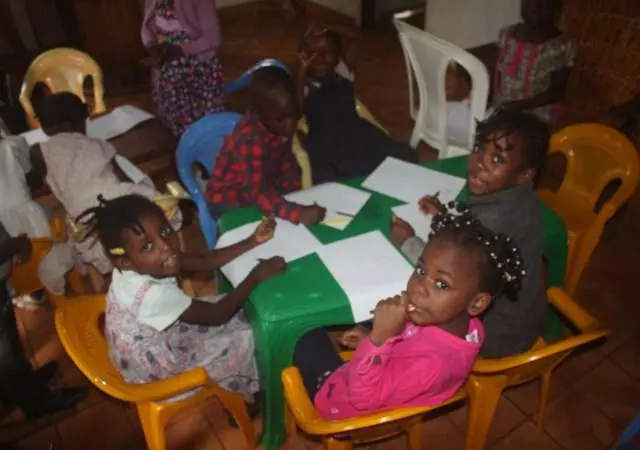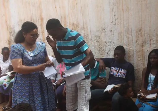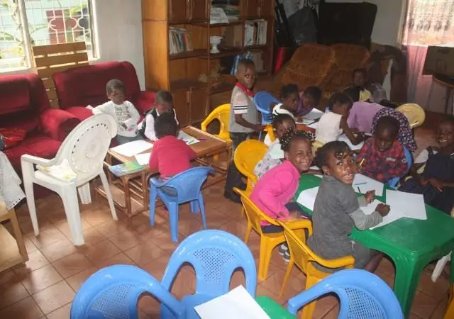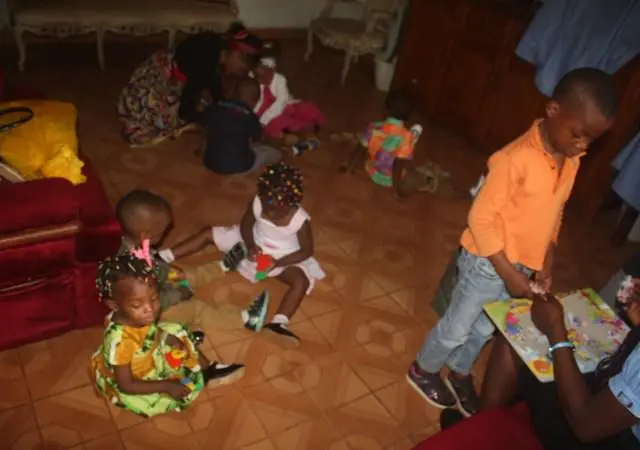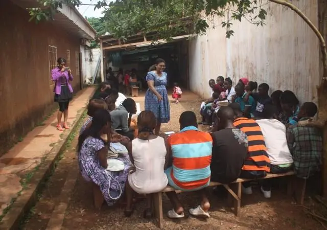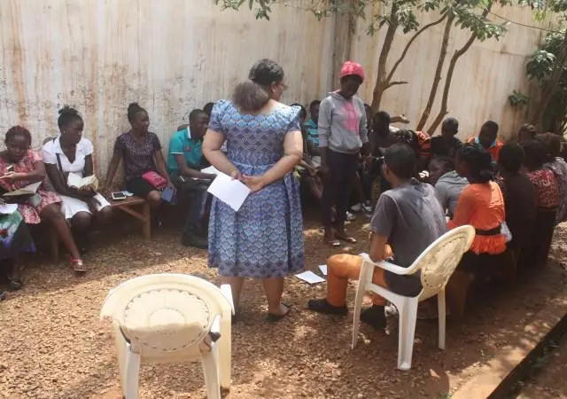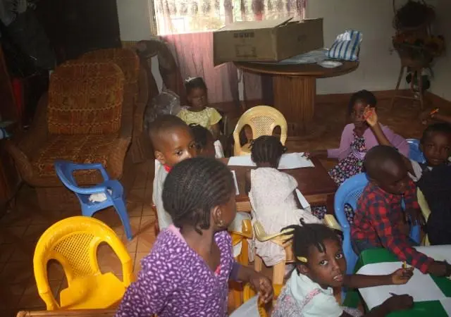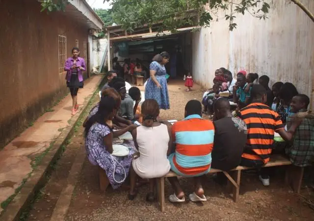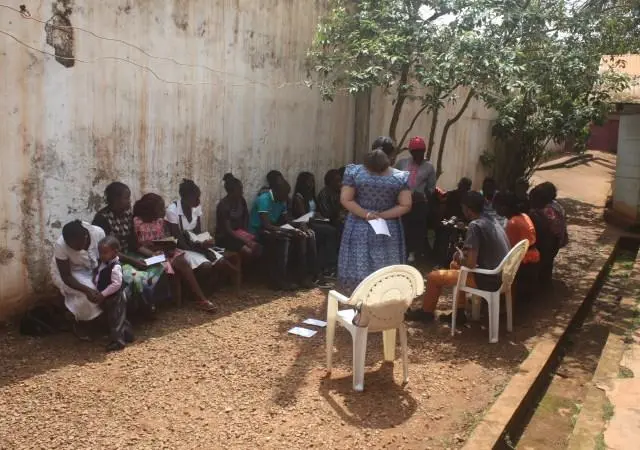A Sunday morning with children in Ngousso Center. We have three classes: Class one for children from 2 to 6 years inside the house. Class 2, gathered children from 7 to 11 years and they meet at the garage. And the last class, is a group of teenagers and they have their meetings outside under a guava tree.